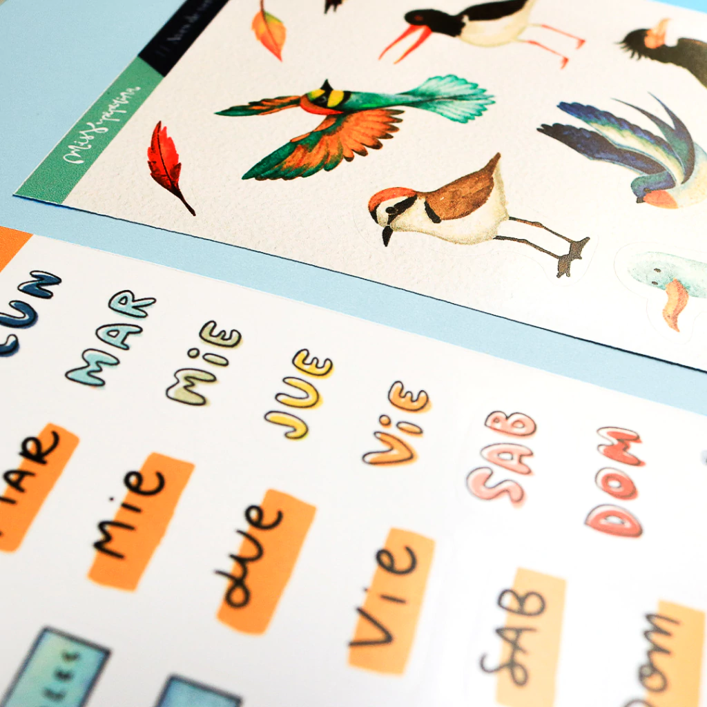- 2 planchas de stickers troquelados en vinilo full color, una con dibujos y otra con días de la semana.