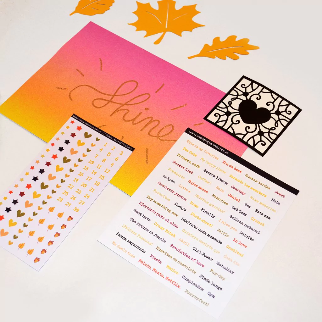 - 1 plancha de stickers con frases en español e inglés de 12,5 x 15 cm